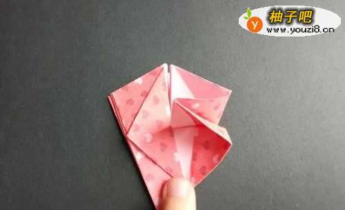 9将纸的正面朝上,将下面部分捏住,全部往中间收拢成为一个有八个尖角的图形,折好后每个部分用手指展平,展平后就成为一个八瓣的花哈。