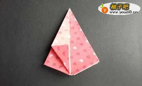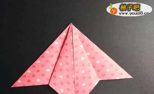 3将纸的左右两边往中间竖线对折,背面也往中间对折,折好后,将下面多出的三角形部分上面折叠,背面同样运作。