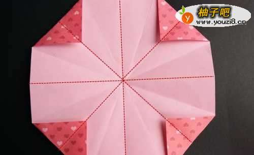 4全部折好后展开,背面朝上,将纸的四个角沿折痕如图折叠,沿每条折痕将纸沿折痕所在的直线折叠,加深每一条折痕。