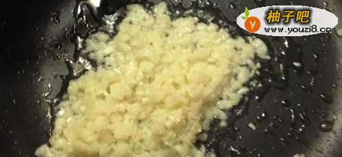 5烧热油放入蒜蓉,并放入姜丝、辣椒炒香,不用太久,防止蒜蓉给炒黑了啊,炒完将它们放在虾上面。