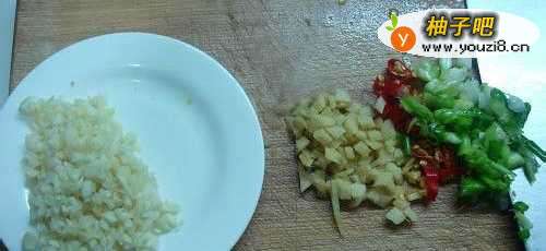 3准备好蒜头、姜、葱、辣椒(如果不喜欢辣的你也能不用加辣椒哦),切好放一边备用。