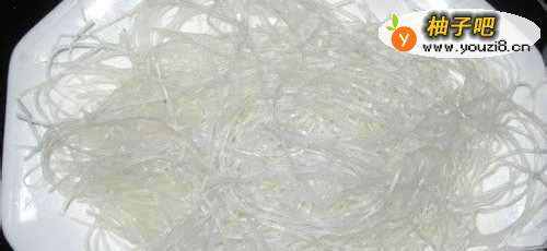 4准备好适量粉丝,并泡水浸软,大约5-10分钟,浸软后捞起粉丝装盘,加上酱油或是盐调均待用,盘底最好不要带水,带水蒸完不太好吃,我试过了。
