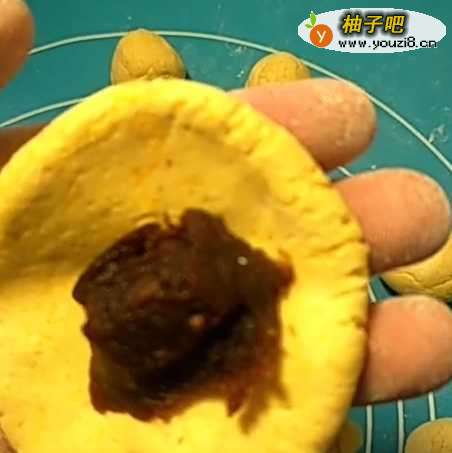3揉成光滑的面团,分成小机子,压扁包入豆沙馅;