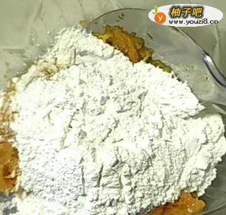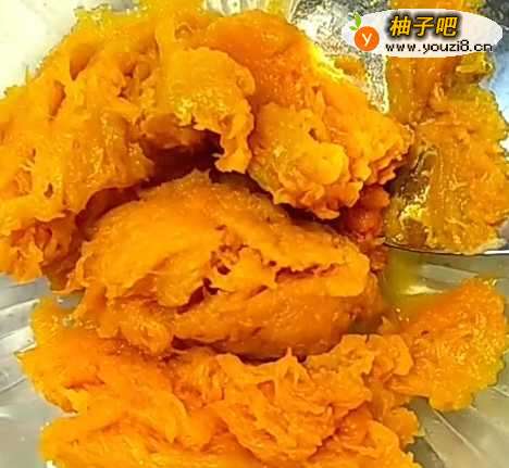 2将篜好的南瓜捣成泥,加入适量的糯米粉;