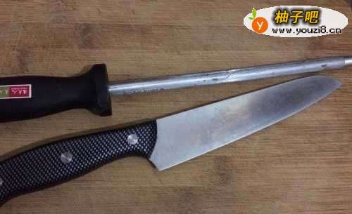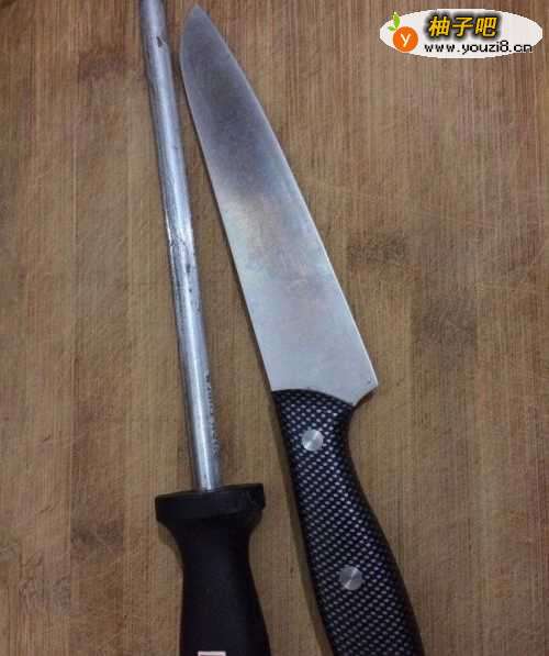 准备好要磨的刀和磨刀棒。