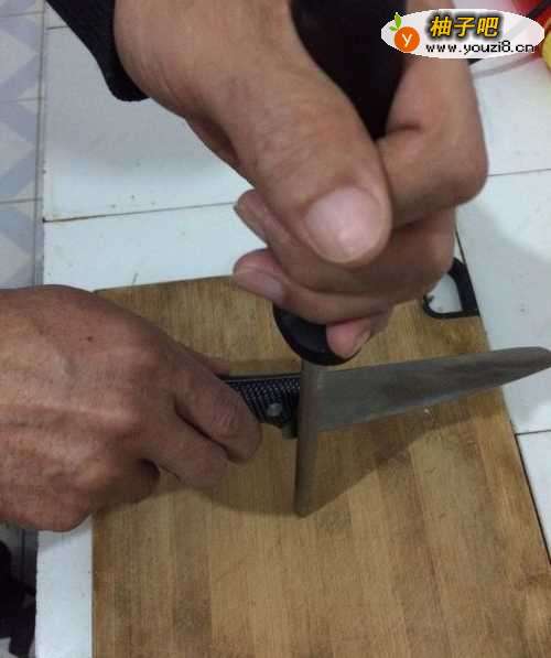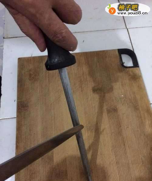 6第二种磨刀办法:左手拿着磨刀棒倾斜放置,右手拿刀与第一种磨刀办法一样,改为上下轮换拉磨。
