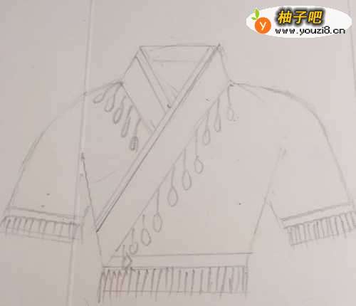 5第五步 再画上袖口上 和领子下这两处的压边和穗子 还有中腰上的