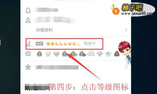 4QQ好友等级排名浏览步骤四:进入账号个人详情页以后。点击界面上的等级图标。