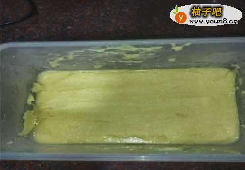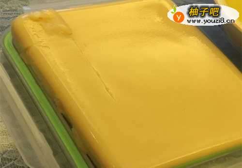 6炒后的豌豆泥用保鲜盒直接装起来,再放到冰箱放入冰箱冷藏4个小时,直到完全凝固定型成块即可。