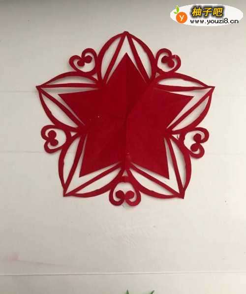7第七步 剪完外围多余的彩纸之后 再剪里面的斜线部分 直线部分 还有其它的镂空部分等等 全部剪完之后 展开压平 一副漂亮的花样如意五角星就裁剪完成了