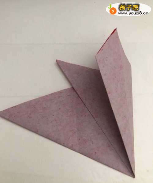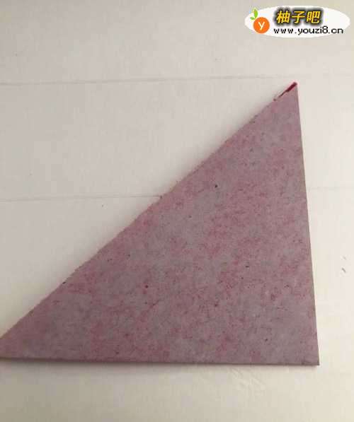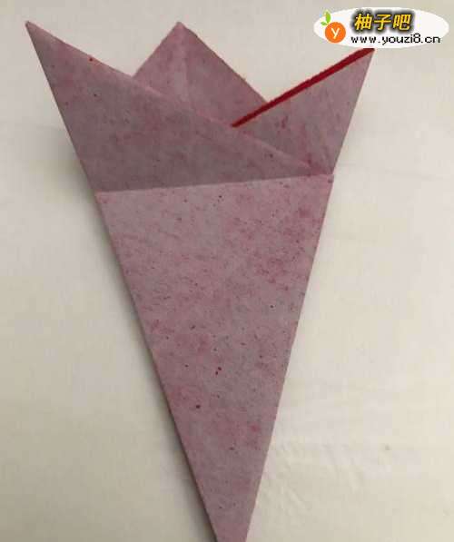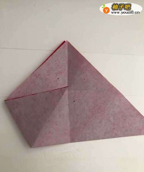 第一步 取一张边长为16厘米的正方形红色彩纸 先把它从下向上对角折叠 然后再从右向左对角折叠整齐