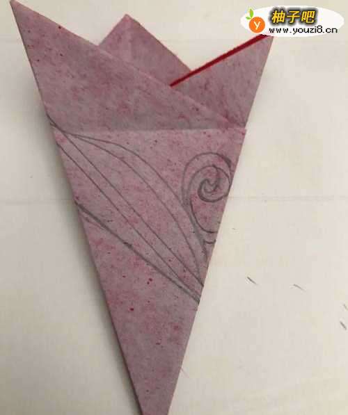5第五步 都折好之后 用绘图铅笔 在中间部分先画上一道斜线 斜线外面画上弧线也能按自己的喜好画上如意勾等装饰小图案