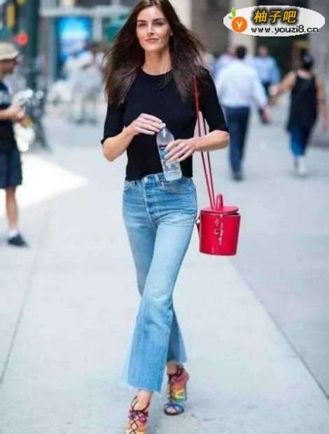 搭配六:浅蓝色九分牛仔裤九分牛仔裤是很现在很流行的裤型,不仅显腿长,而且还很利落,浅蓝色九分牛仔裤搭配一件藏蓝色针织短袖,时尚又显身材。