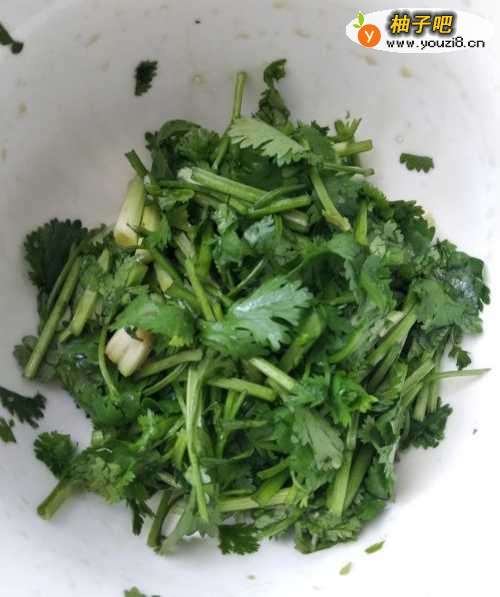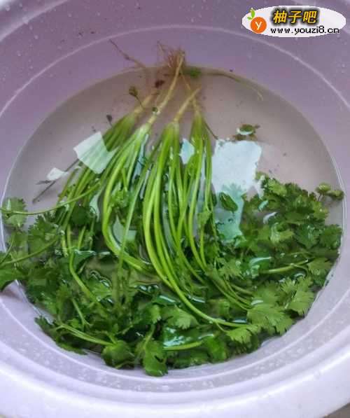 4把香菜放碗里,放一点盐、糖、醋、生抽拌匀。把大蒜干辣椒切碎备用。