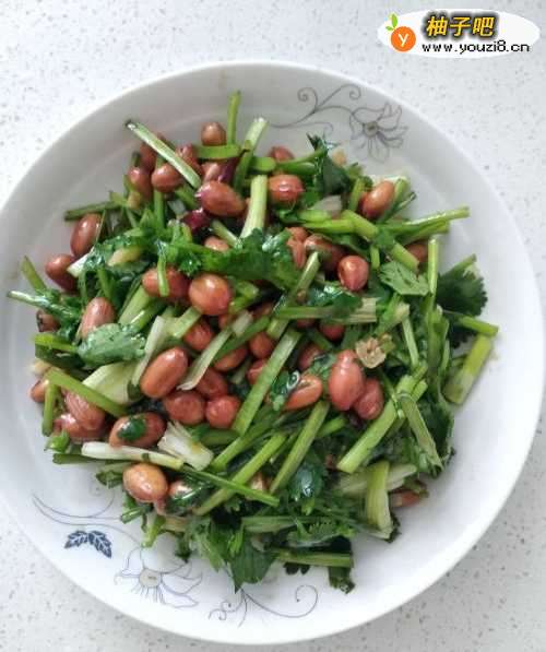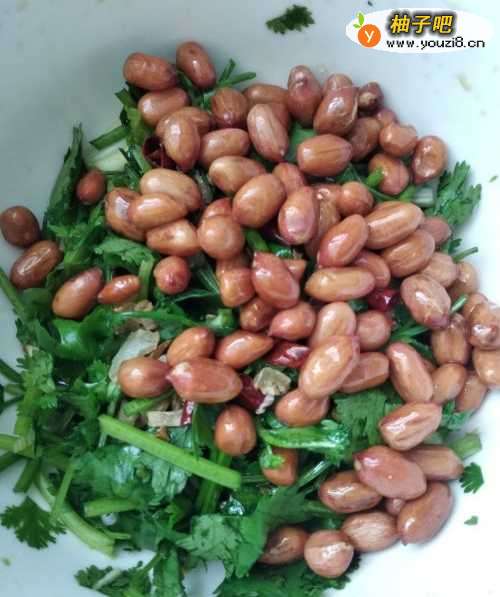 6然后倒入适量的花生米,继续拌匀后装盘,这样好吃的凉拌香菜花生米就做好了。