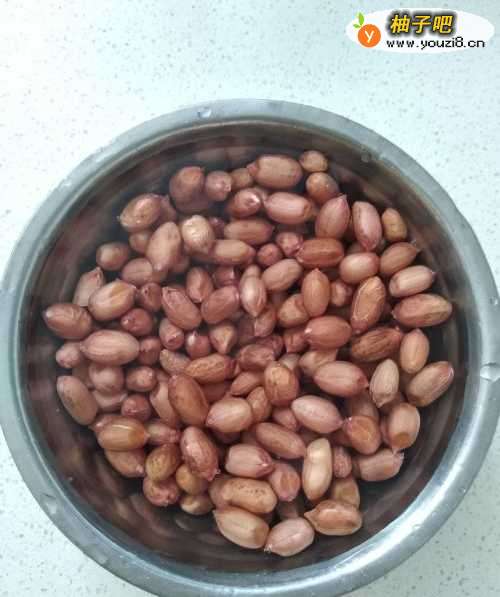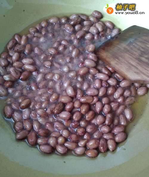2锅里放油倒入花生米,小火不停翻炒,炒到变色,出香味盛起。