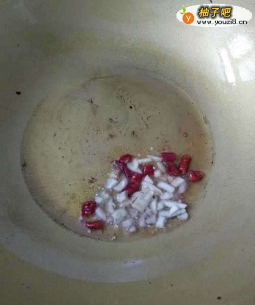 5锅里放油烧热后关火,倒入干辣椒和蒜末炒香后倒入香菜碗里拌匀。