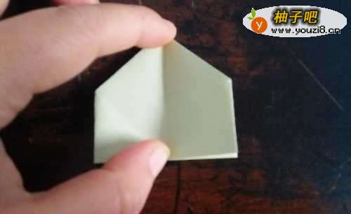 5我们把中间的向下按压,然后并在一起。把下边的角向上折,如图二图三。