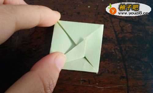 4把下边的角分别向内折,如图一,并把角插进折纸的内部,如图二。其他的一样运作。