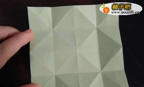 我们把彩纸的中间先折出一个米字型,再把四个角向内折,开启后,翻到背面。把四条边向内折。
