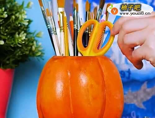 自制南瓜笔筒。