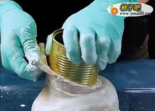 6然后用橡皮筋把水泥罐子扎捆起来。