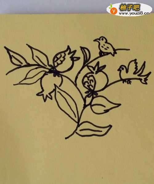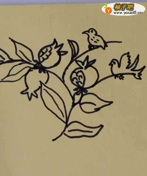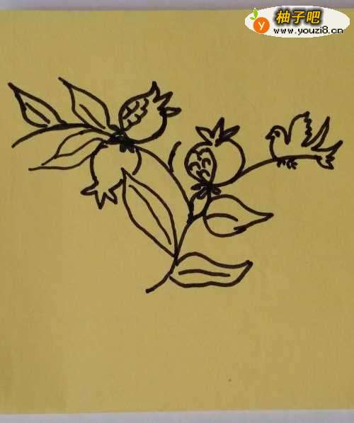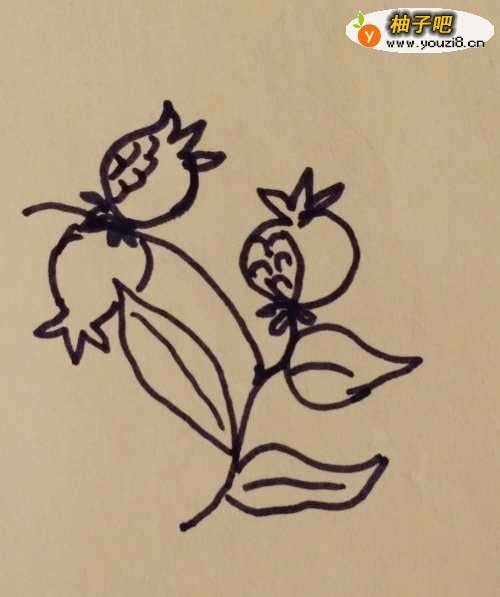 3我们再继续往上画一条向左侧伸的树枝,然后在上面画上两只对称的石榴