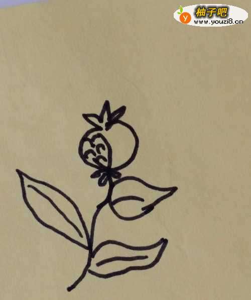 2然后我们在叶子的上方画上一只石榴,把左边的地方画成裂开的样子,并画上很多石榴籽