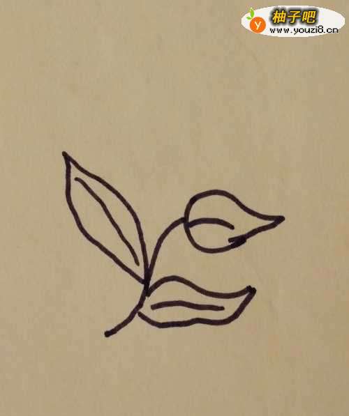 我们先在纸上画上一条弧线,然后我们在上面画上一些叶子,并在叶子中间画上一条线做叶脉