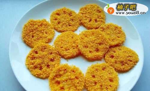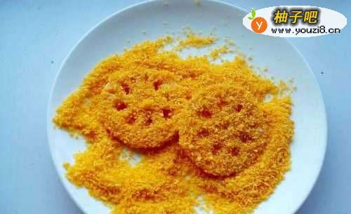 6再把藕片在面包糠里裹均匀,沾上面包糠后能用力捏一下,这样能使面包糠更好的沾在藕片上。