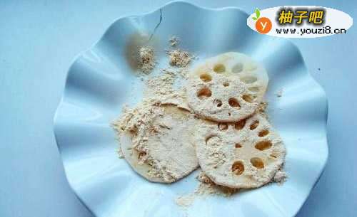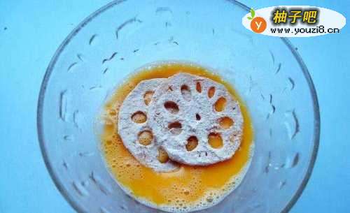 5把沾上炸鸡粉的藕片,在鸡蛋液里来回滚几次,让鸡蛋液均匀裹住藕片
