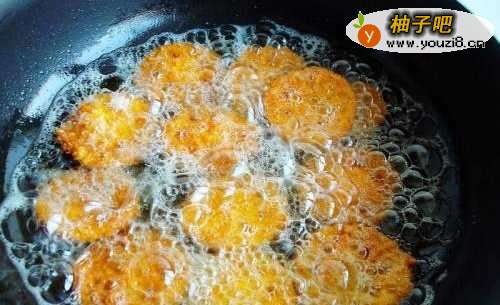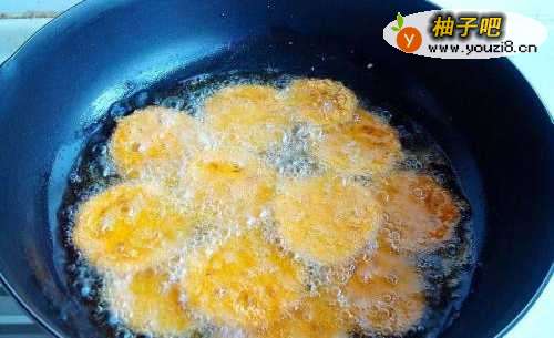 8油温烧至6成左右下藕片,中火炸定型关小火慢慢浸炸至藕片全部飘起捞出,沥干油