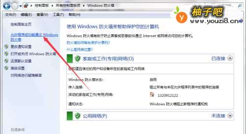 3点击箭头所指的“能够程序或功能通过Windows防火墙”进入
