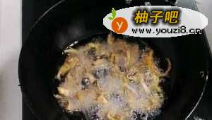 5油温七成热下锅炸,中小火慢炸,一天一条下锅太慢,也能加一堆放进锅里,用筷子搅拌一下就散开了