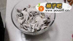 平菇在水里淘洗两遍,撕成条,然后攒在手里一把一把地捏出水来甩一甩??,正常力度挤一下水就行,防止后边炸的时候溅油~