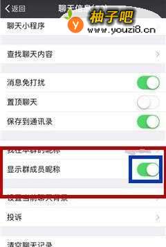 4在聊天信息配置中,下拉页面,找到“显示群成员昵称”配置。点击后面白色滚珠启用。显示绿色代表已开启配置。