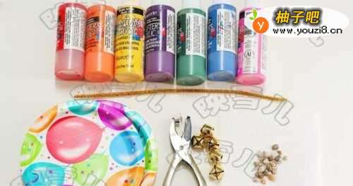 小号纸碟两个,打孔机,颜料,金色毛根,铃铛,小石子。