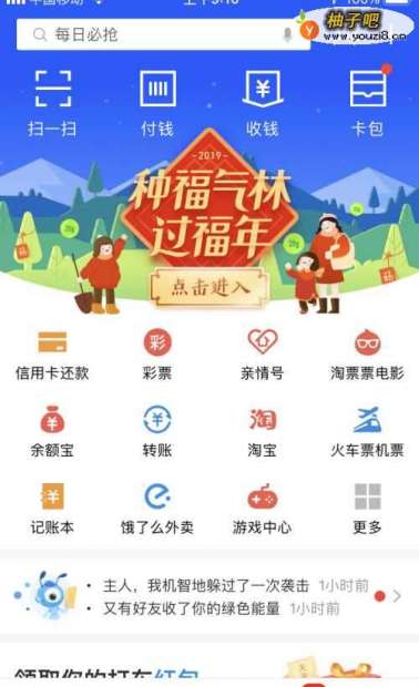 开启支付宝,在支付宝首页中,我们能看到一个巨大的活动横幅,种福气林过福年活动