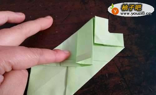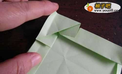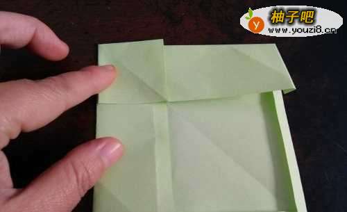 3把两个角开启向内折,如图一。然后翻到背面后,把角向下折,把上边的部分也折过来。如图三。
