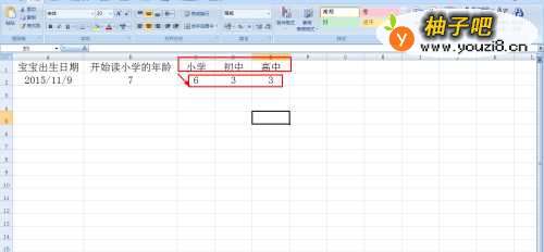 3接着分别在C2、D2、E2单元格输入小学、初中和高中学习需要的年数,如分别输入:6、3、3。