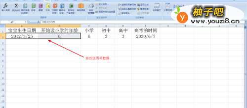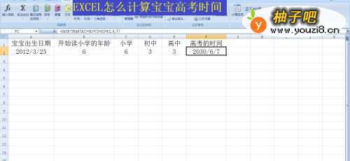 EXCEL如何计算宝宝高考时间:(1)输入出生日期;(2)输入上小学的年龄;(3)输入小学、初中和高中学习需要的年数;(4)输入公式计算出宝宝高考的时间:=DATE(YEAR(A2)+B2+C2+D2+E2,6,7);(5)date是计算日期的公式——year(a2)提取A2单元格的年份,然后再加读书前的年龄和读书时的年数,6指月份,7指天数;(6)修改出生日期和上小学年龄就能自动计算其他宝宝高考时间了。