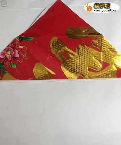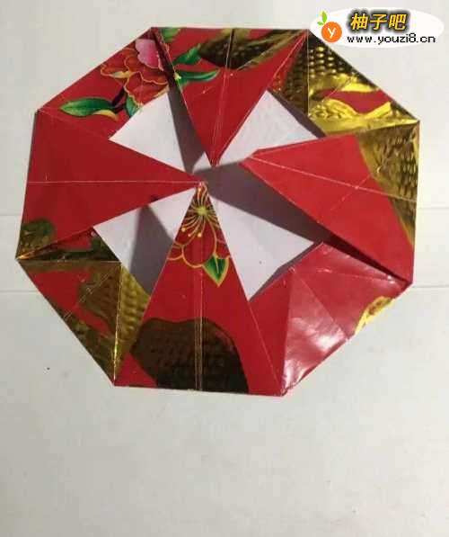 7第七步 四个角都向中心折好之后 再把它上下翻过来 从中线的奔左下方向和右下方向的两条斜线的最下头连成一条斜线向上折叠 顺势把角带出来