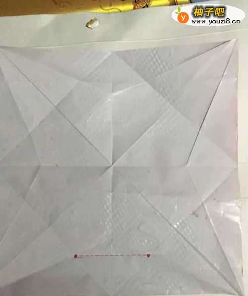 2第二步 四个角都折好之后 再把它取开 然后再从下向上对角折叠 折后取开 再把另一条对角线也折上