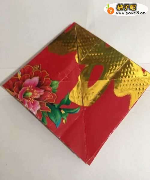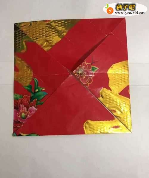 8第八步 带出来一个角之后 折倒压平 然后再把其它三个角按同样的方式步骤向上折倒 每一个角与角对齐