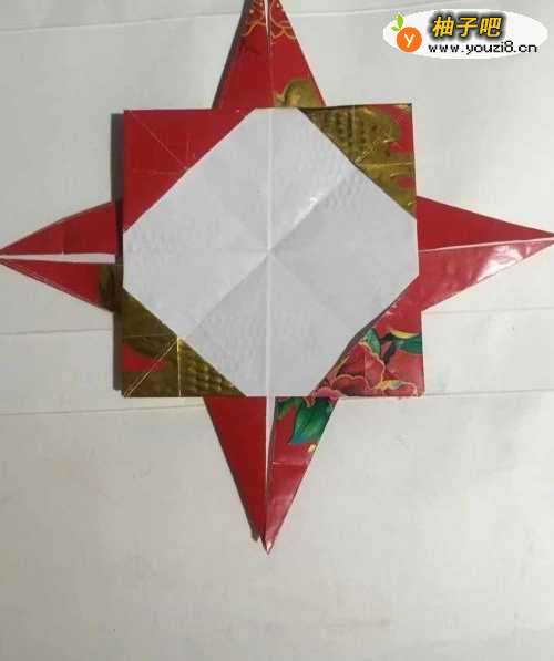 儿童手工折纸之 一副漂亮的北极星小相框 如何用彩纸折叠 预备材料 正方形彩纸 先把它折叠成为一个双正方形 然后再把四个角取开 当中折叠一道横折痕 每一个角再聚拢折在一起 四个角的尖角都折至中心点 最后翻到四条边的外面再折倒即可
