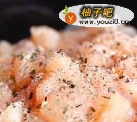 3鸡胸肉切丁,倒入黑胡椒粉盐腌制。