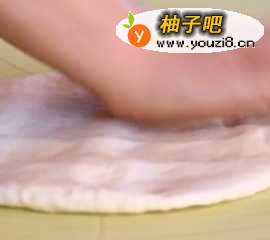 6在面饼上戳上气孔、刷上蛋液,刷上一层番茄酱。