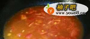 加入适量蕃茄酱,盐和糖,中火翻炒,直至炒出红油,西红柿的块儿状逐渐减少。