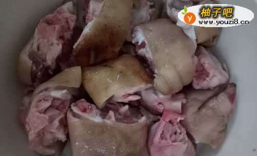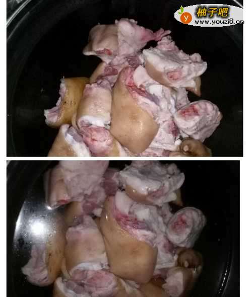 3处理干净的猪脚放进高压锅,加水没过肉。