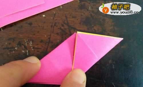 2然后再把相对的两个角向内折,如图一。启用彩纸,如图二。按照折痕把边向内折,如图三的样子。
